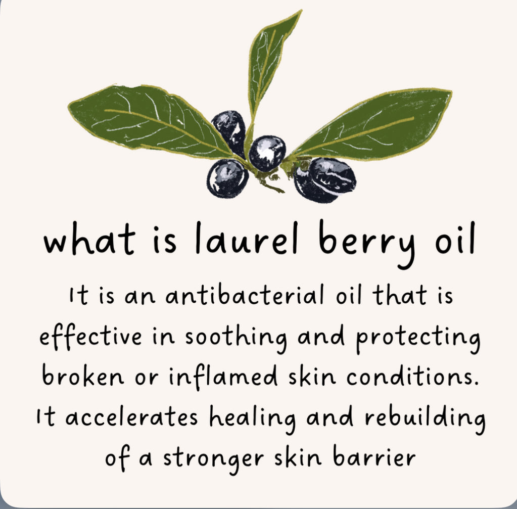 Laurel Berry has a rich consistency and strong antibacterial properties, and It is especially soothing and is known for its ability to moisturize and support severely dry, flaky skin, sensitive skin conditions and other problematic skin issues.