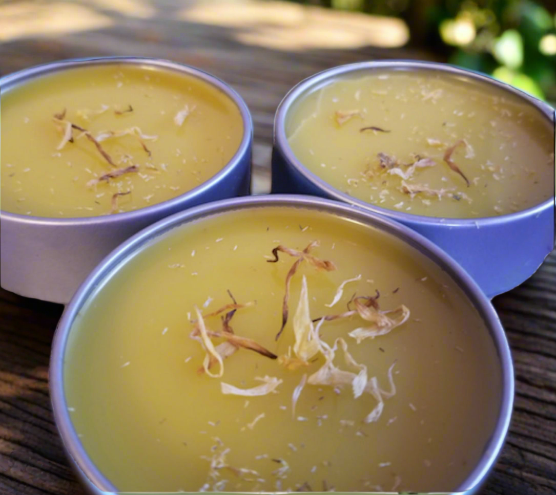 Infused Botanical oil, Unrefined extra virgin organic olive oil, vegan wax, Chamomile, Calendula flowers